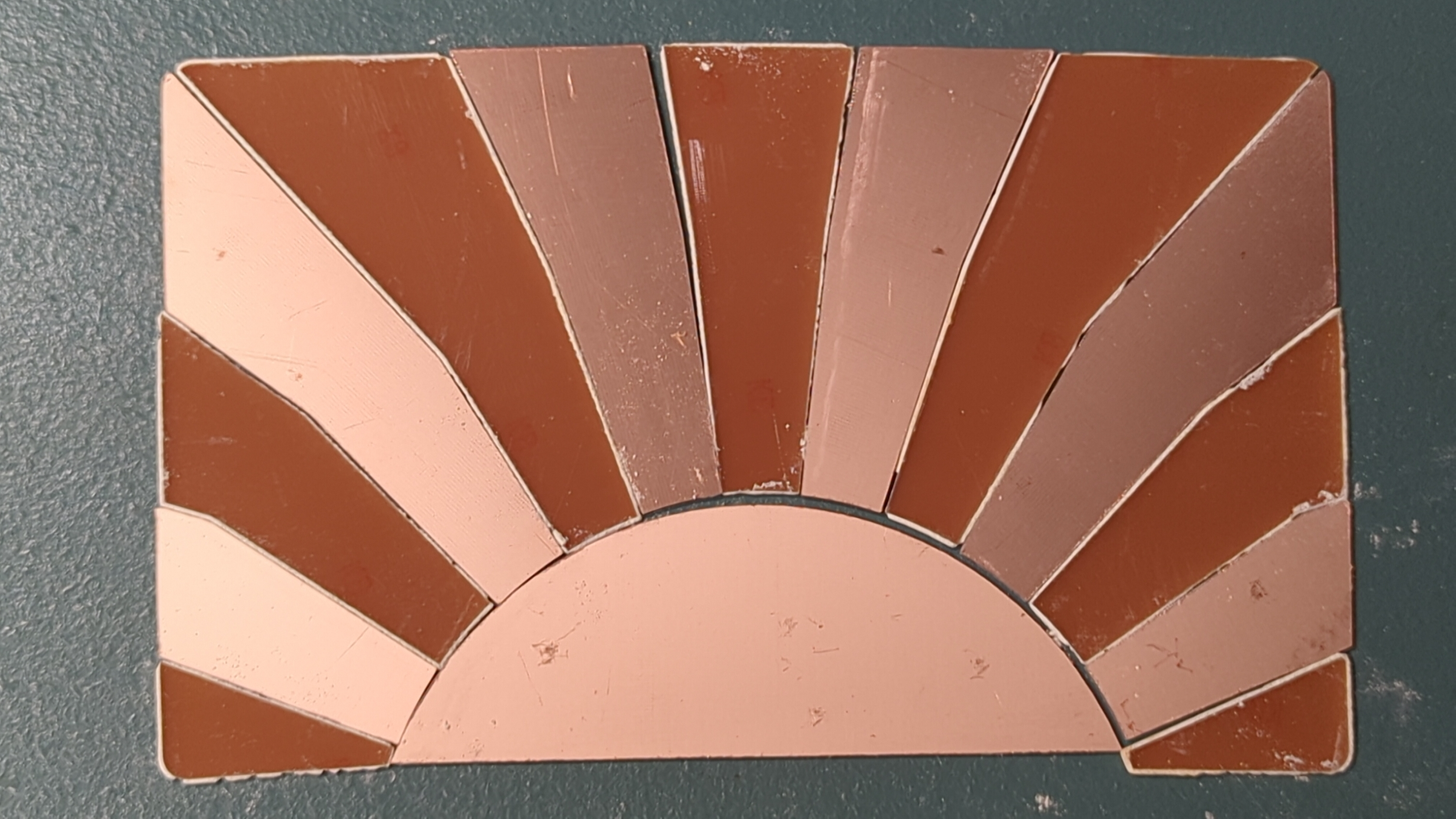 After cutting, I washed all the parts in warm soapy water and dried them well. I read that a lemon juice and salt paste could brighten the copper, but I didn’t see any change. Maybe the parts were already bright enough that there wasn’t much for the mixture to do. If I understood chemistry better, then maybe I could say something about the expected outcome. Anyway, I continued by sanding the edges lightly to remove some sharp edges leftover from the cuts and roughly arranging the parts in their final positions.