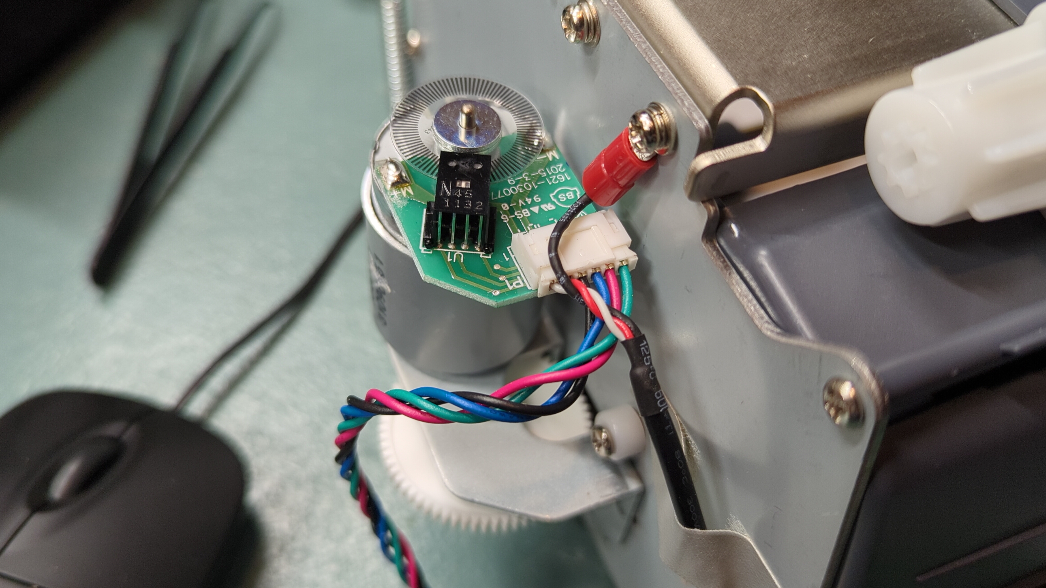I opened the machine’s enclosure, and I was pleased to find not only a sturdy and well-made set of internal assembly, but also that the control board appears to be entirely separable from the mechanical components. This is great because it leaves open the possibility of fully replacing the control board, at least in principle. The X and Y motors both receive power from ordinary press-fit connectors on the main board, along with what I assume are signal wires for the rotary encoders. The tool head connection is more complicated and delicate because it uses a ribbon cable, and it’s not clear whether the tool head has some computing hardware in it or is simply taking power from the main chip over the ribbon. The main chip itself appears to be some variety of PIC32.4 Power for the machine comes in through a barrel jack.